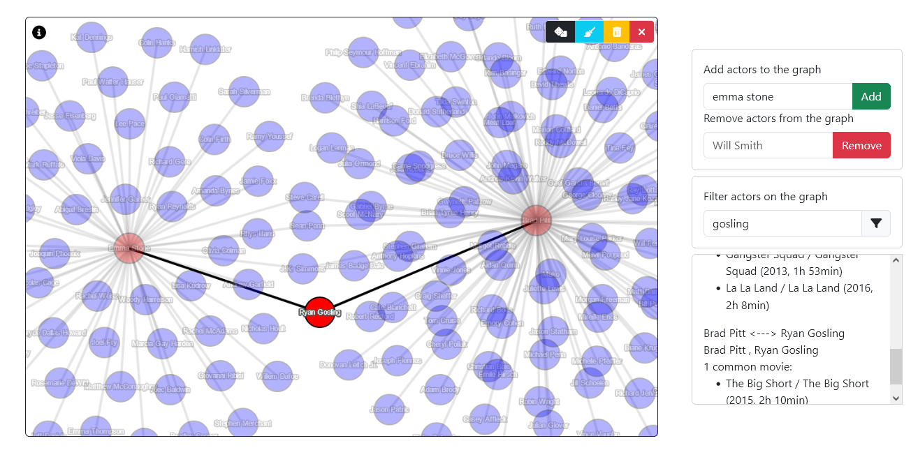 Displaying the whole network seemed a bit daunting at first. With hundreds of thousands of actors, it would be an intricate mesh of nodes and edges and require tremendous computation power on both client-side on server-side. Moreover, we usually are interested in a small portion of the network, so I let the user add the desired actors on its own.